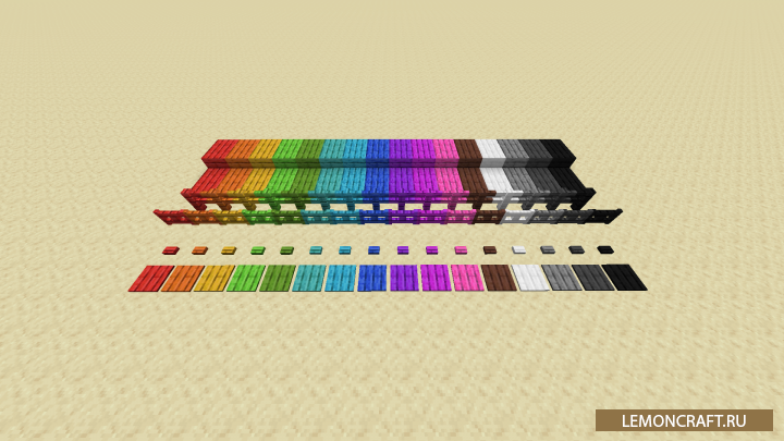Мод на окрашенные доски Глитчи Glitchy's Dyed Planks добавляет в игру просто огромное количество новых, разноцветных блоков досок в которые входят заборы, ступени, кнопки, калитки, нажимные пластины и другое. Все цветные варианты досок вы можете получить объединив их с ванильными красителями на верстаке. Так же вы сможете использовать эти доски в процессе крафта ванильных рецептов (инструменты, кровати, сундуки).